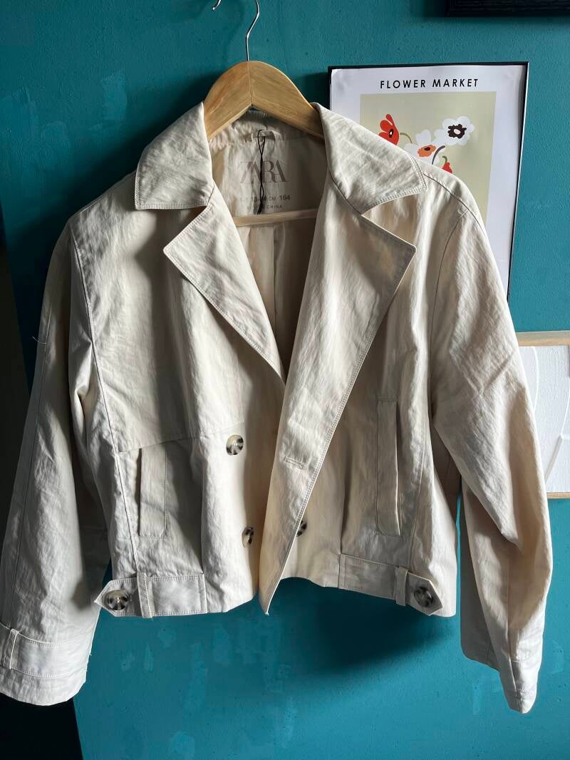 One cropped trench coat- perfect for summer days where it's too warm from a jumper, but feel naked in just a top. This is less formal than a long coat and is suitable for petite and short people to help them not drain themselves in fabric. This was in size 13-14-year-olds in the kid's section, which is perfect for us petite girls. Please, no VAT; it's a bonus. Plus, it has ample pockets for your lipgloss phone and wallet. This is perfect if you do not feel comfortable in a full-blown trench, do not want to splash out, and do not like the fit. This is also a perfect one for city breaks. It is thin and easy to pack, but its neutral colour means it goes with everything. It is lightweight for those warm, windy days on the pier.
