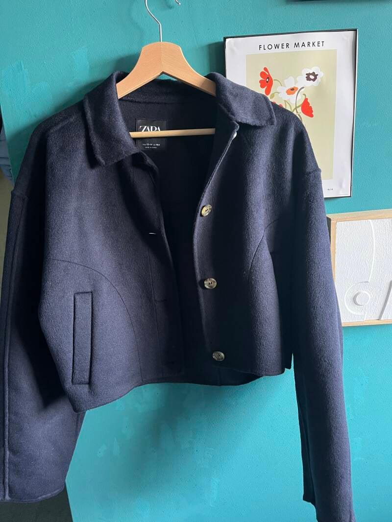 The cropped wool blend coat navy blend has a crushed velvet texture, and some would find the fabric irritating to the skin; however, there is another arm space to wear a jumper. Maybe the one I spoke about above. This is a perfect formal jacket, which is not a suit jacket. Being navy, it goes with everything, perfect for autumn when a coat is too much, and it is usually chic enough for your pavement catwalk.