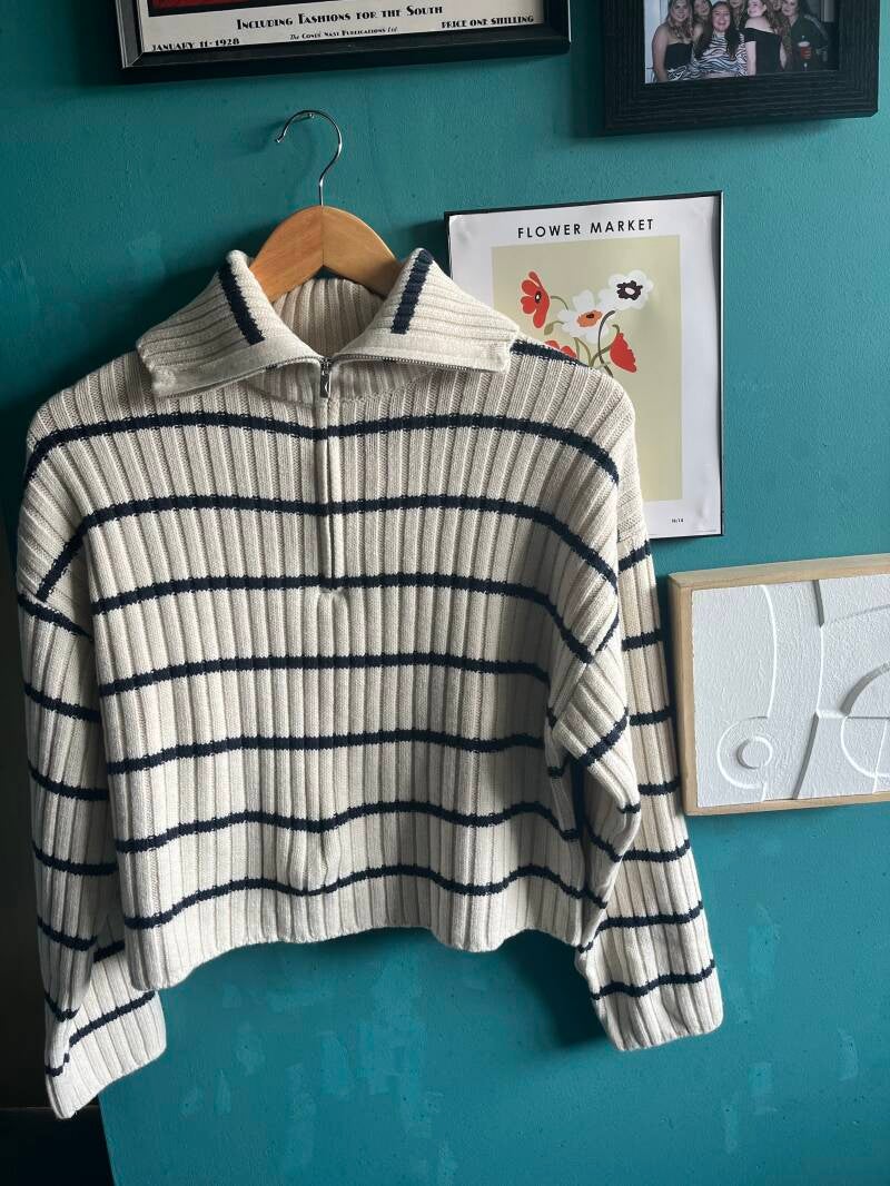 Striped knit sweater ecru/navy- this striped ribbed textured jumper is like the one below. I had something I had been looking for for a while but could not find one I liked. This has a ¾ zip at the top, so there are no makeup marks. It has a floppy overcollar to bring definition to the look. This is a perfect nip for the shop's jumper when you have gym clothes under. To look more formal, dress it up with suit trousers, jeans, or a blazer or jacket on top.